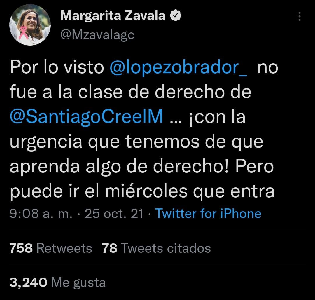 “Por lo visto @lopezobrador_ no fue a la clase de derecho de @SantiagoCreelM … ¡con la urgencia que tenemos de que aprenda algo de derecho! Pero puede ir el miércoles que entra.”
