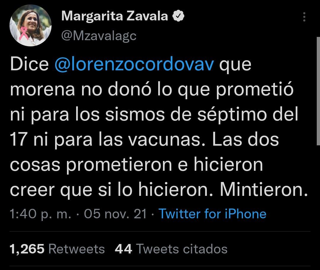 Margarita Zavala, afirma que el partido de Morena solo miente, promete y no cumple, lo anterior luego de los señalamientos de Lorenzo Córdova sobre los donativos del partido a damnificados por el sismo.