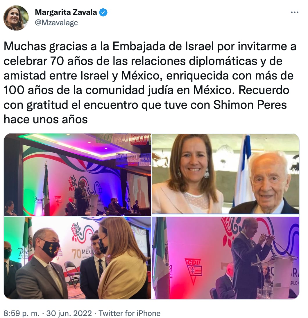“Muchas gracias a la Embajada de Israel por invitarme a celebrar 70 años de las relaciones diplomáticas y de amistad entre Israel y México, enriquecida con más de 100 años de la comunidad judía en México. Recuerdo con gratitud el encuentro que tuve con Shimon Peres hace unos años”