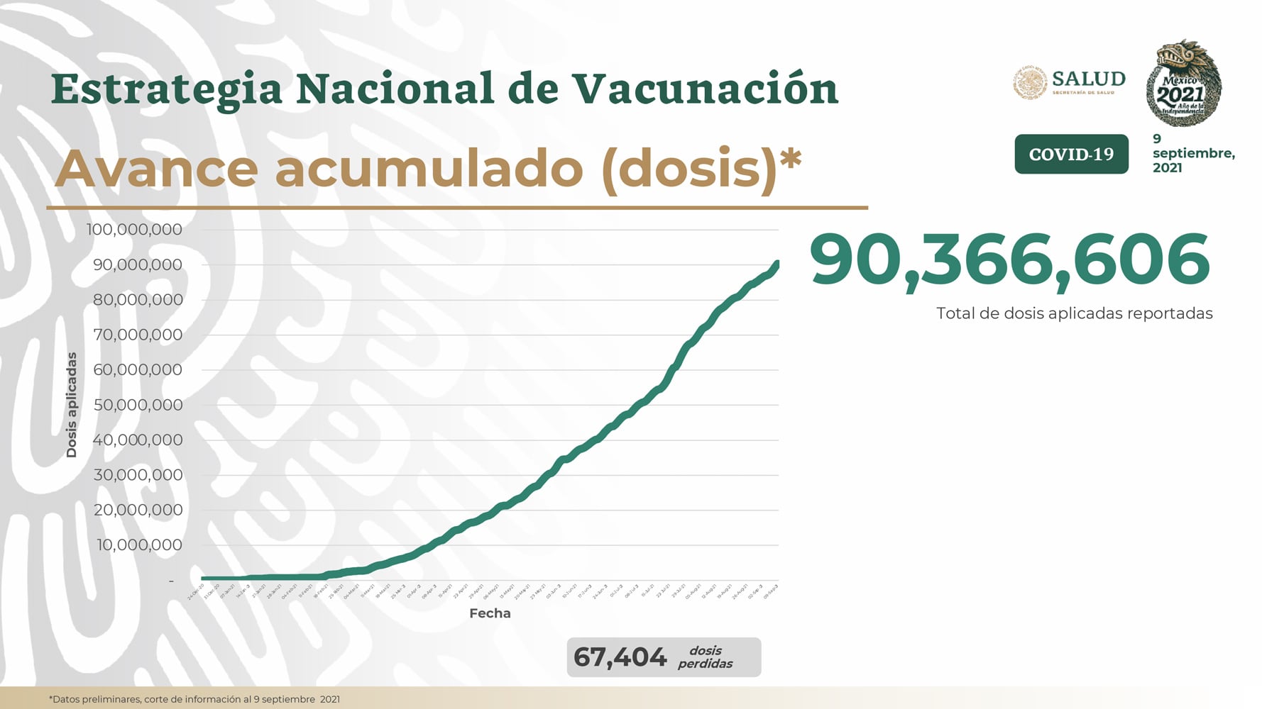 “El 09 de septiembre se aplicaron 865 mil 661 dosis de vacunas contra #COVID19. Hasta este día, en México suman 90 millones 366 mil 606 dosis suministradas. Es muy importante que acudan a vacunarse las personas embarazadas para disminuir riesgos de hospitalización y defunción”
