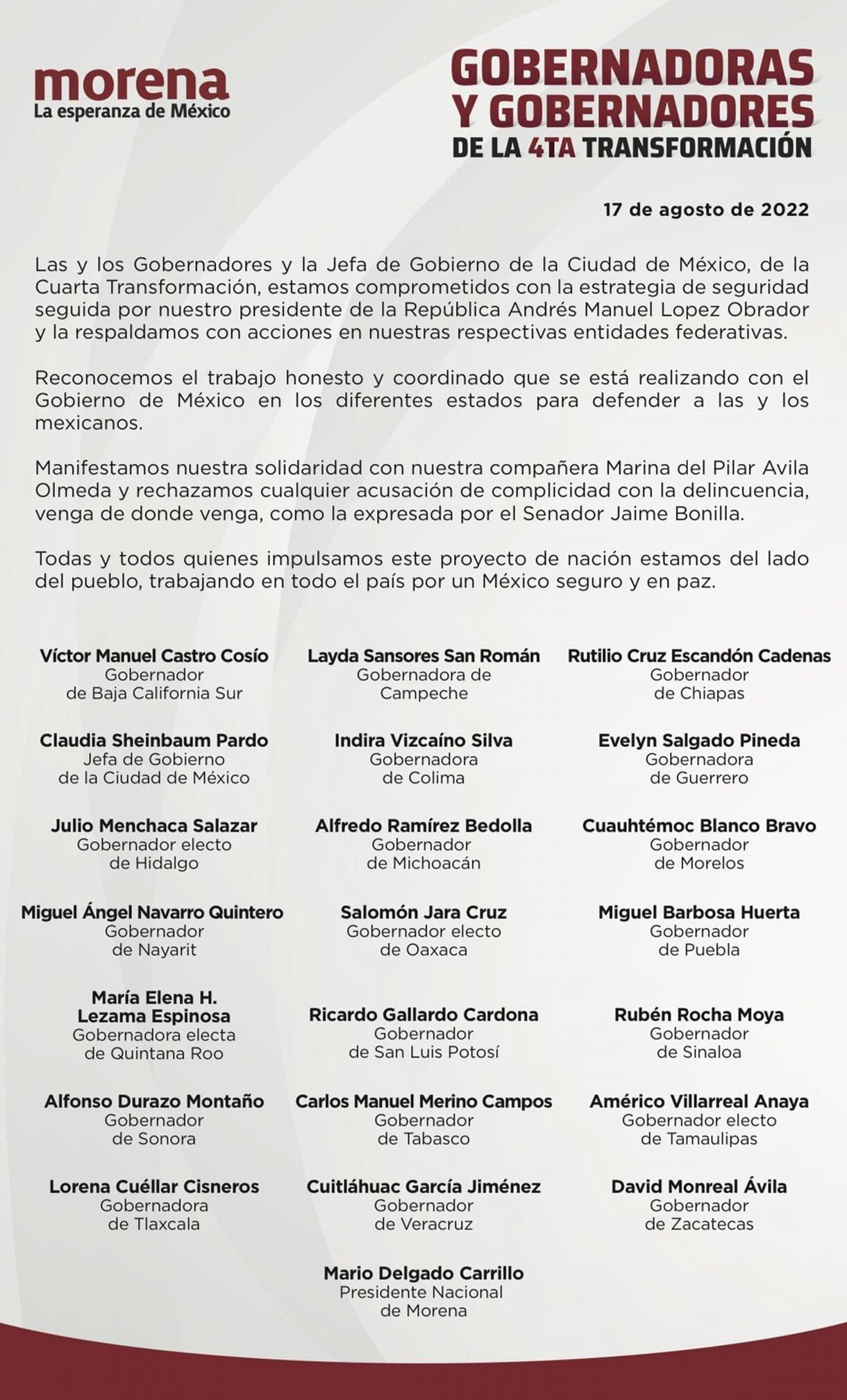 “Manifestamos nuestra solidaridad con nuestra compañera Marina del Pilar Ávila Olmeda, y rechazamos cualquier acusación de complicidad con la delincuencia, venga de donde venga, como la expresada por el senador Jaime Bonilla. Todas y todos quienes impulsamos este proyecto de nación, estamos del lado del pueblo, trabajando en todo el paìs por un México seguro y en paz”