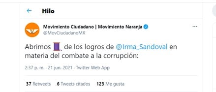 A través de Twitter, Movimiento Ciudadano, comenzó un polémico “hilo” en donde supuestamente se enlistaban los logros de Irma Sandoval en materia del combate a la corrupción.