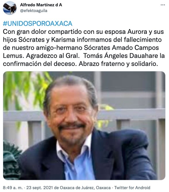 “Con gran dolor compartido con su esposa Aurora y sus hijos Sócrates y Karisma informamos del fallecimiento de nuestro amigo-hermano Sócrates Amado Campos Lemus. Agradezco al Gral. Tomás Ángeles Dauahare la confirmación del deceso. Abrazo fraterno y solidario”