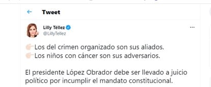 A través de redes sociales Lilly Téllez ha declarado que pareciera que para el presidente AMLO la atención para los niños con cáncer no es prioritaria, considerándolos adversarios.