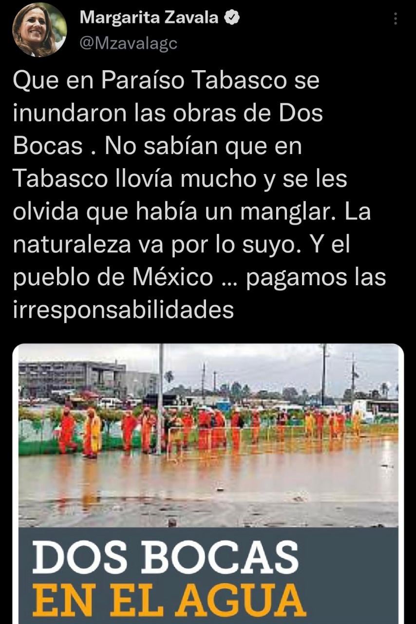 A través de redes sociales, la diputada federal Margarita Zavala se pronunció declarando que “no sabían que en Tabasco llovía mucho y se les olvida que había un manglar”.