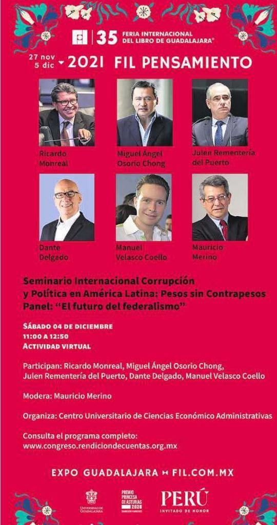 En el panel “El futuro del federalismo, que se llevará a cabo de forma virtual el sábado 4 de diciembre de las 11:00 a 12:50 horas en la FIL Guadalajara.