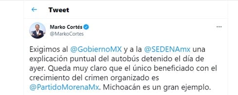“Exigimos al @GobiernoMX y a la @SEDENAmx una explicación puntual del autobús detenido el día de ayer. Queda muy claro que el único beneficiado con el crecimiento del crimen organizado es @PartidoMorenaMx. Michoacán es un gran ejemplo.”