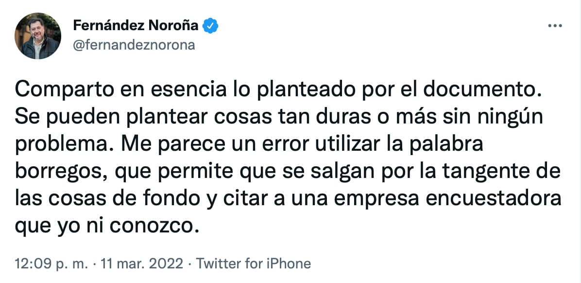“Comparto en esencia lo planteado por el documento. Se pueden plantear cosas tan duras o más sin ningún problema. Me parece un error utilizar la palabra borregos, que permite que se salgan por la tangente de las cosas de fondo y citar a una empresa encuestadora que yo ni conozco”