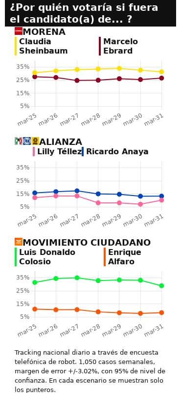 Por Morena, si las elecciones fueran hoy, siguen a la cabeza en la intención del voto de la ciudadanía la jefa de la CDMX, Claudia Sheinbaum, y a cinco puntos de distancia el secretario Marcelo Ebrard. Por la posible coalición de PAN-PRI-PRD aún encabezan las preferencias (aunque con números muy bajos) Ricardo Anaya y Lilly Téllez; y por Movimiento Ciudadano continúan Luis Donaldo Colosio y Enrique Alfaro con mayor apoyo. En el caso del alcalde regiomontano, sus números continúan siendo de los más competitivos.