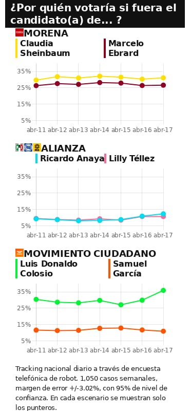 Los tres punteros de las dos coaliciones y Movimiento Ciudadano crecieron. En el caso de Claudia Sheinbaum fue menor a un punto, Ricardo Anaya 1.4% y Luis Donaldo Colosio fue quien más creció con 6 puntos porcentuales.