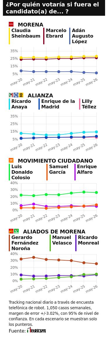 - Por Morena, Claudia Sheinbaum liderando de manera continua con un 28.3%; le sigue Marcelo Ebrard con un 26.4% de la intención del voto y Adán Augusto López con un 6.7%