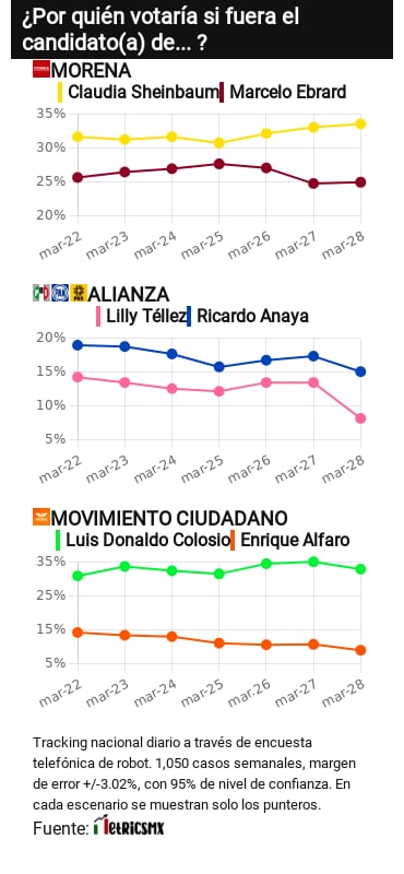 - En la oposición a AMLO (que concentra aspirantes de PRI, PAN y PRD), la carrera por ahora ubica a dos contendientes: Ricardo Anaya, con 15%, y la senadora Lilly Téllez, con 8.1%. La tendencia se mantiene estable entre ambos aspirantes.