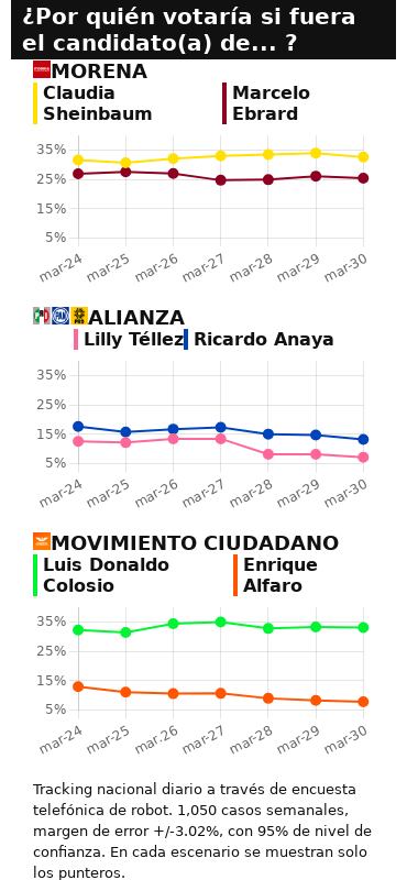 Para conocer los cambios en el sentir ciudadano y los hechos de los posibles candidatos, se ofrece este tracking diario de SDPnoticias. El cual es un ejercicio estadístico hecho en conjunto con MetricsMX para poder determinar desde hoy quién se perfila para estar en la elección de 2024 y competir por la presidencia de México.