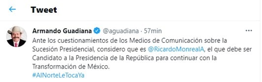 “Ante los cuestionamientos de los Medios de Comunicación sobre la Sucesión Presidencial, considero que es @RicardoMonrealA, el que debe ser Candidato a la Presidencia de la República para continuar con la Transformación de México.”