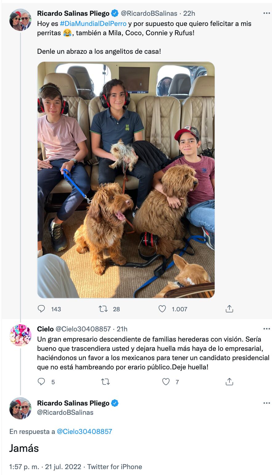 Ricardo Salina Pliego fue cuestionado en Twitter mientras celebraba el Día Mundial del Perro, sobre si buscaría la presidencia en las próximas elecciones 2024.