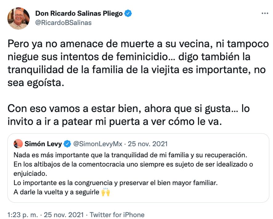 Sin embargo, Salinas Pliego le recordó que la tranquilidad de la familia “de la viejita” también es importante por lo que le pidió a Simón Levy ya no amenazar de muerte a su vecina.