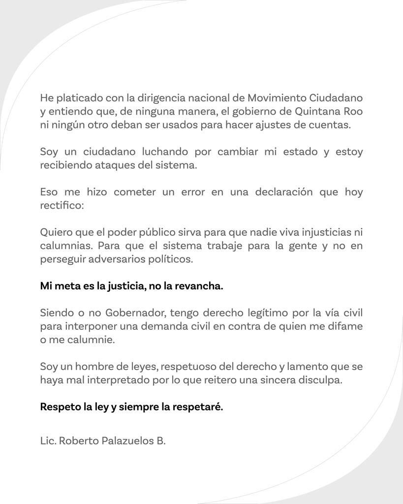 A través del comunicado, Roberto Palazuelos refiere que de ninguna manera el gobierno de Quintana Roo, ni ningún otro deben de ser usados para hacer ajustes de cuentas.