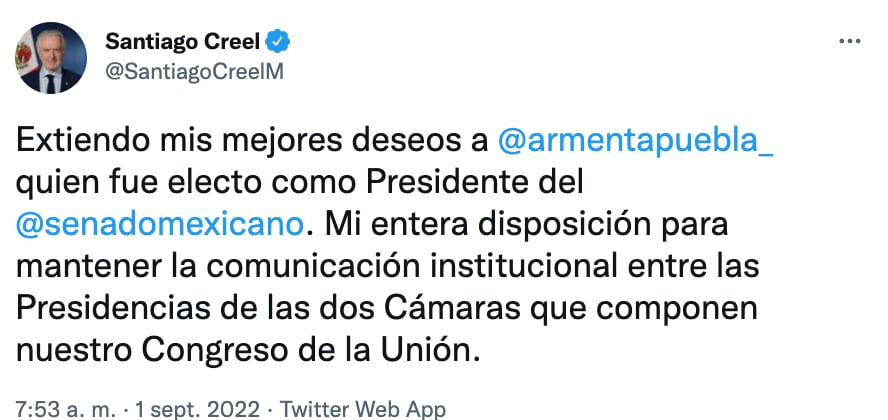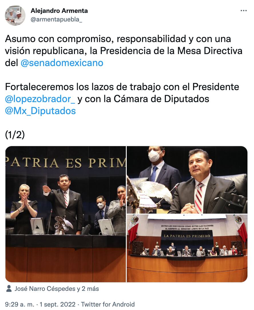 “Extiendo mis mejores deseos a @armentapuebla_ quien fue electo como Presidente del @senadomexicano. Mi entera disposición para mantener la comunicación institucional entre las Presidencias de las dos Cámaras que componen nuestro Congreso de la Unión”