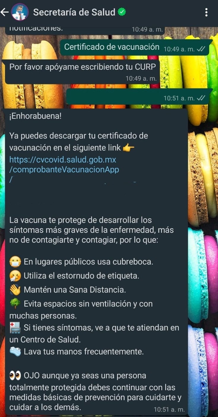 El segundo método para tramitar el certificado de vacunación Covid-19 es vía WhatsApp. Para esto, es necesario enviar un mensaje desde la aplicación al número 5617130557 de la siguiente manera