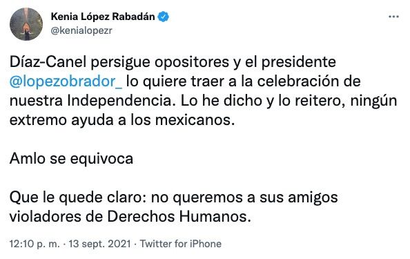 “Lo he dicho y lo reitero, ningún extremo ayuda a los mexicanos. Amlo se equivoca Que le quede claro: no queremos a sus amigos violadores de Derechos Humanos”