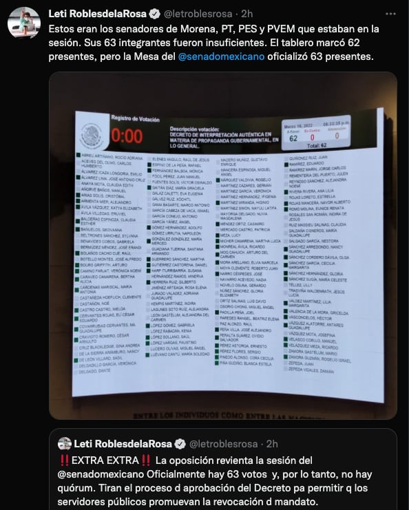 “La oposición revienta la sesión del @senadomexicano. Oficialmente hay 63 votos y, por lo tanto, no hay quórum. Tiran el proceso de aprobación del Decreto para permitir que los servidores públicos promuevan la revocación de mandato”.