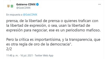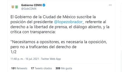“El Gobierno de la Ciudad de México suscribe la posición del presidente @lopezobrador_ referente al derecho a la libertad de prensa, el diálogo abierto, y la crítica con transparencia: “Necesitamos a opositores, es necesaria la oposición, pero no a traficantes del derecho de...”