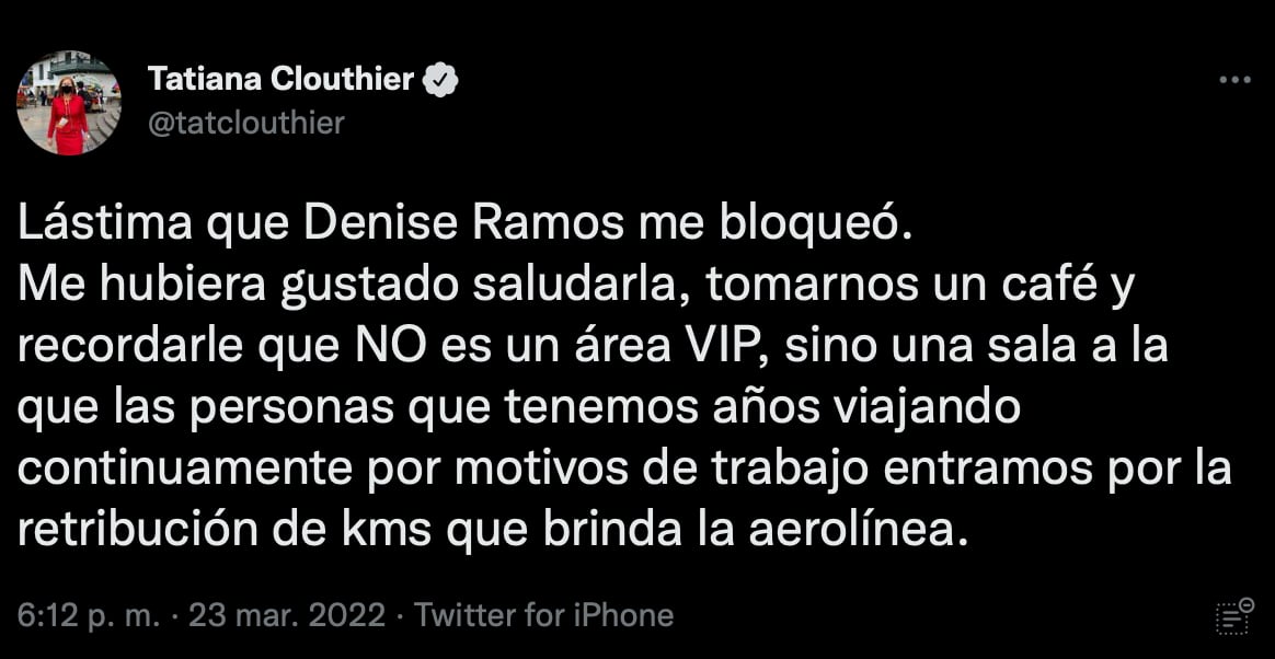 “Lástima que Denise Ramos me bloqueó. Me hubiera gustado saludarla, tomarnos un café y recordarle que NO es una área VIP, sino una sala a la que las personas que tenemos años viajando continuamente por motivos de trabajo entramos por la retribución de kms que brinda la aerolínea”