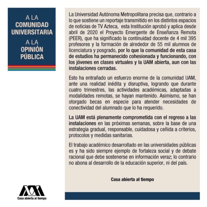 La Universidad Autónoma Metropolitana (UAM), que ya había anunciado su regreso a clases presenciales, respondió a un artículo en video que publicó TV Azteca en su noticiero nocturno de este 27 de septiembre.