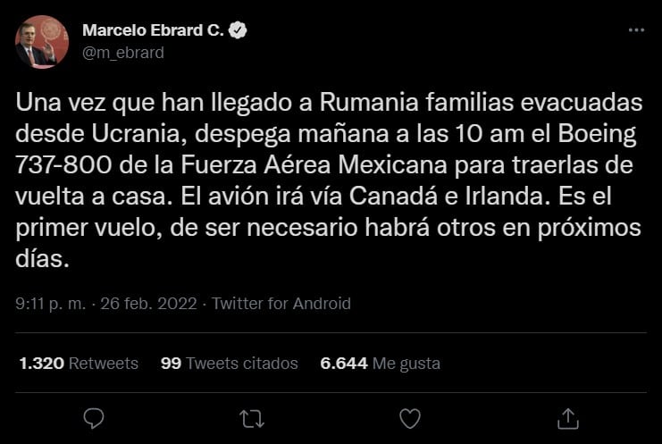 “El Presidente López Obrador ha dispuesto se realice vuelo especial de la Fuerza Aérea Mexicana a Rumania para transportar a las familias que estamos evacuando de Ucrania y desean ser repatriadas a nuestro país. Agradezco el apoyo del Secretario Luis Cresencio Sandoval”.