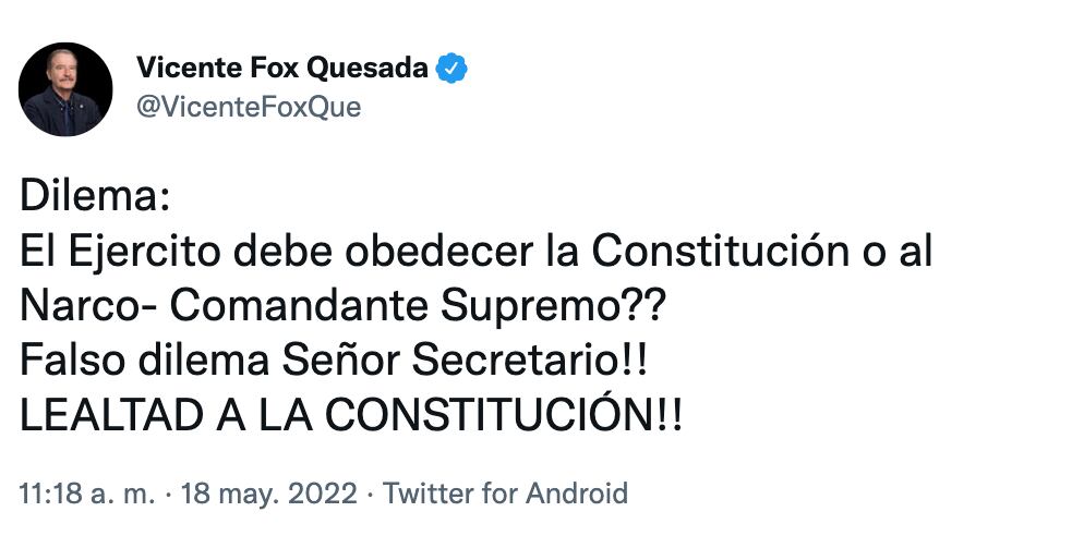 Asimismo, cuestionó el “dilema” de AMLO sobre si las Fuerzas Armadas de México deben obedecer la Carta Magna o “al Narco-Comandante Supremo”.