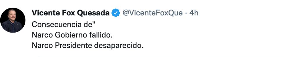 En otras ocasiones Vicente Fox ha criticado el actuar del gobierno ante la violencia que se vive en el país, asegurando que en un “narcogobierno fallido” el “narco presidente” está desaparecido, refiriéndose a la política de seguridad de AMLO.