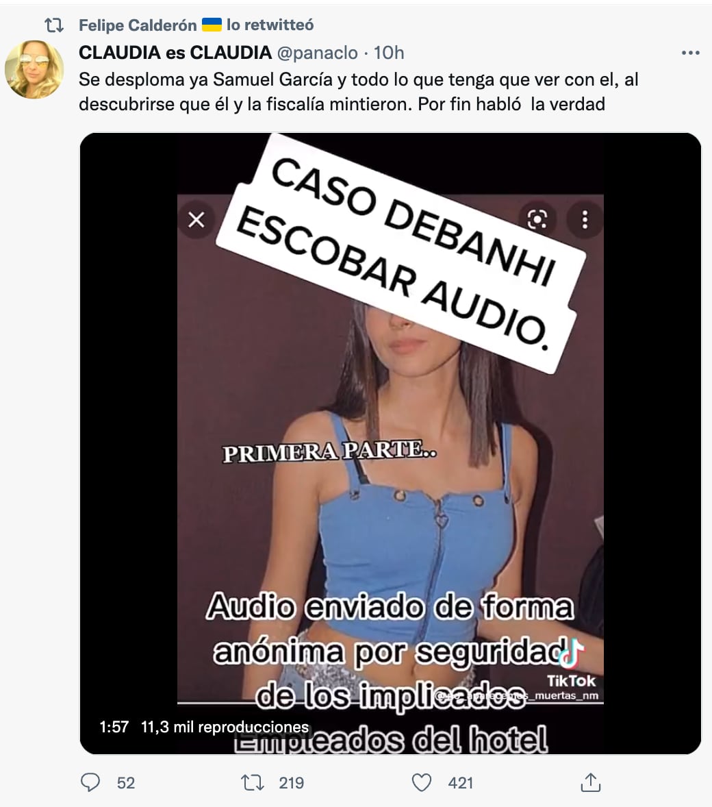 Felipe Calderón retuiteó un audio donde se habla de los supuestos últimos momentos de Debanhi Escobar.