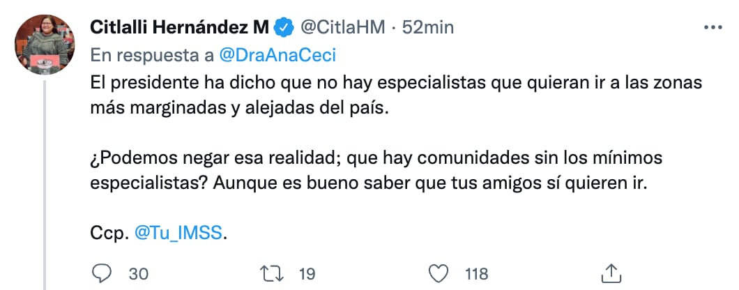 En este sentido, el discurso de la doctora solo mostraría el clasismo con el que han sido formados los médicos en México, pues no quieren trabajar en las zonas más marginadas del país.