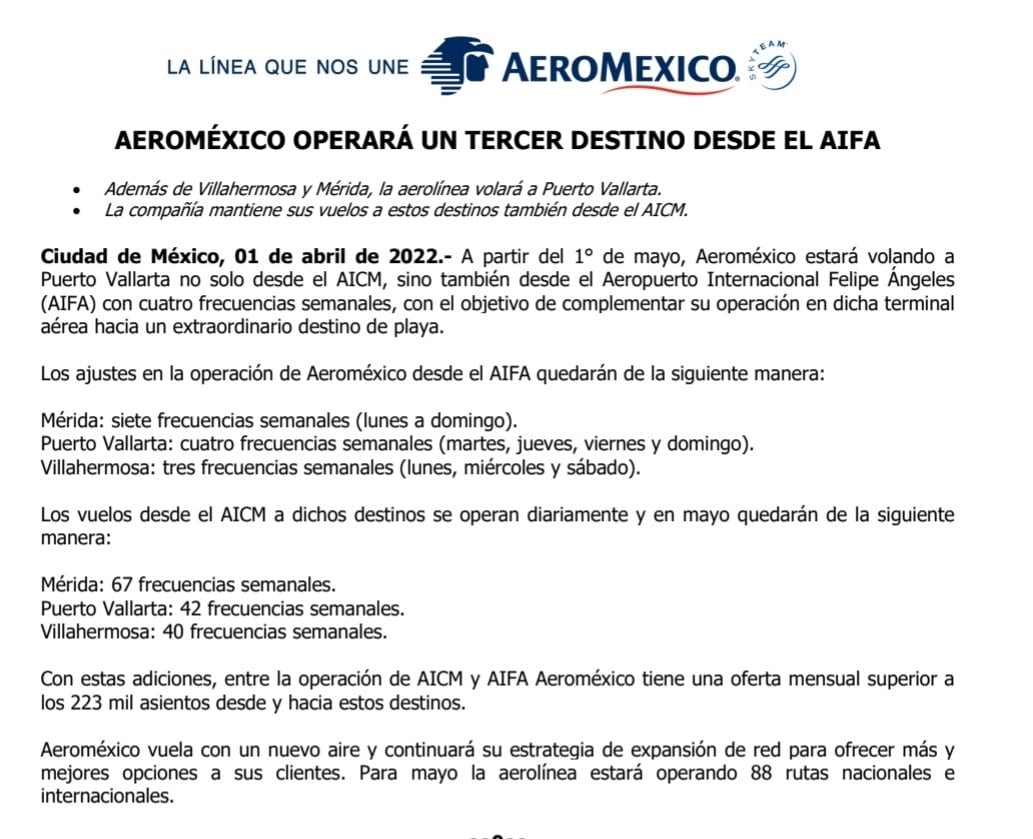 “A partir del 1º de mayo, Aeroméxico estará volando a Puerto Vallarta, no solo desde el AICM, sino también desde el Aeropuerto Internacional Felípe Ángeles (AIFA)”