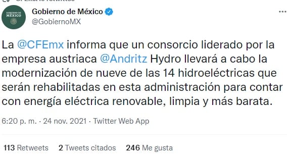 “La CFE informa que un consorcio liderado por la empresa austriaca Andritz Hydro llevará a cabo la modernización de nueve de las 14 hidroeléctricas que serán rehabilitadas en esta administración para contar con energía eléctrica renovable, limpia y más barata.”