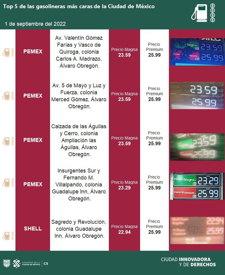 En tanto, el reporte diario del C5 en CDMX, señala los precios de las gasolineras más caras para el día de hoy 1 de septiembre: