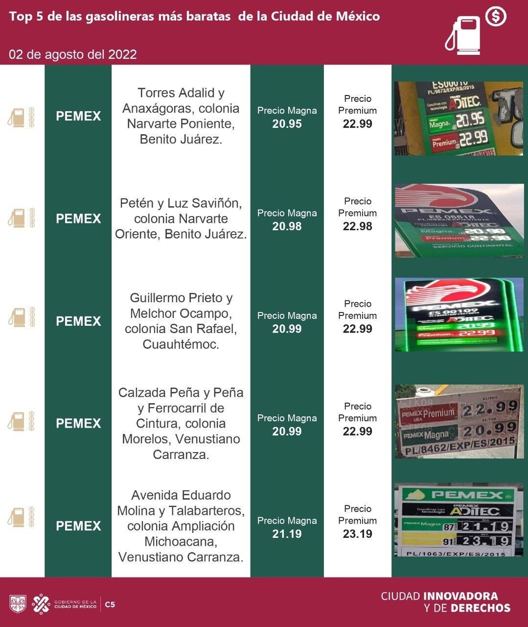 - Pemex: Avenida 5 de Mayo y Luz y Fuerza, colonia Merced Gómez, Álvaro Obregón: Magna: 23.49 pesos y Premium: 25.99 pesos