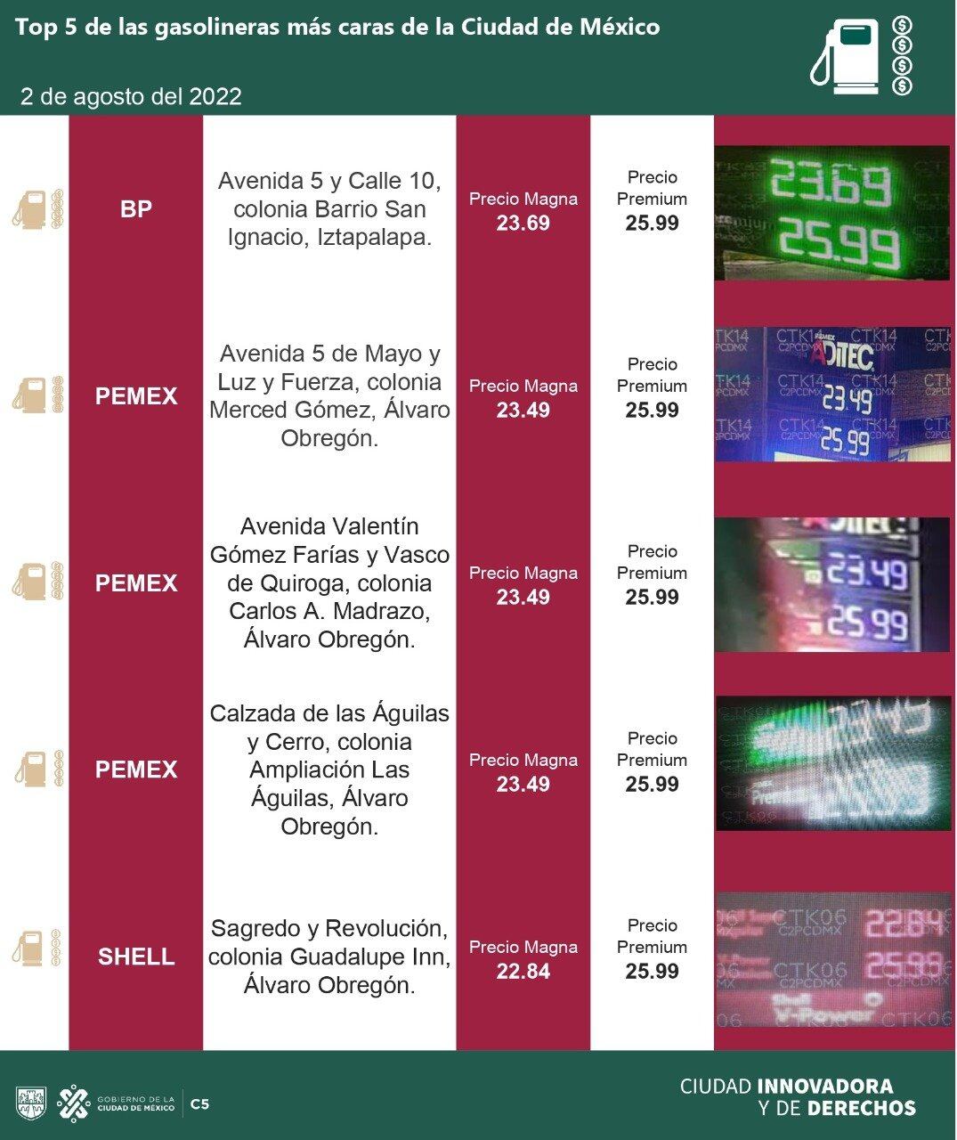 Según el reporte diario del C5 en CDMX, estos son los precios de las gasolineras más caras. Estos son los precios de hoy 2 de agosto de 2022: