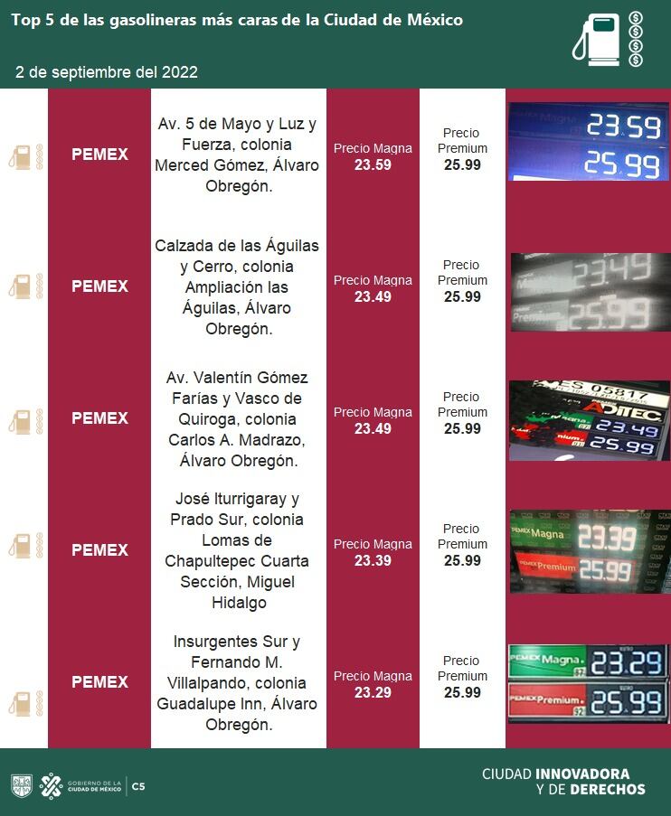En el reporte del C5 se informa hoy cuáles son las 5 gasolineras con los precios más baratos y cuáles son las 5 con los precios más caros de toda la CDMX.