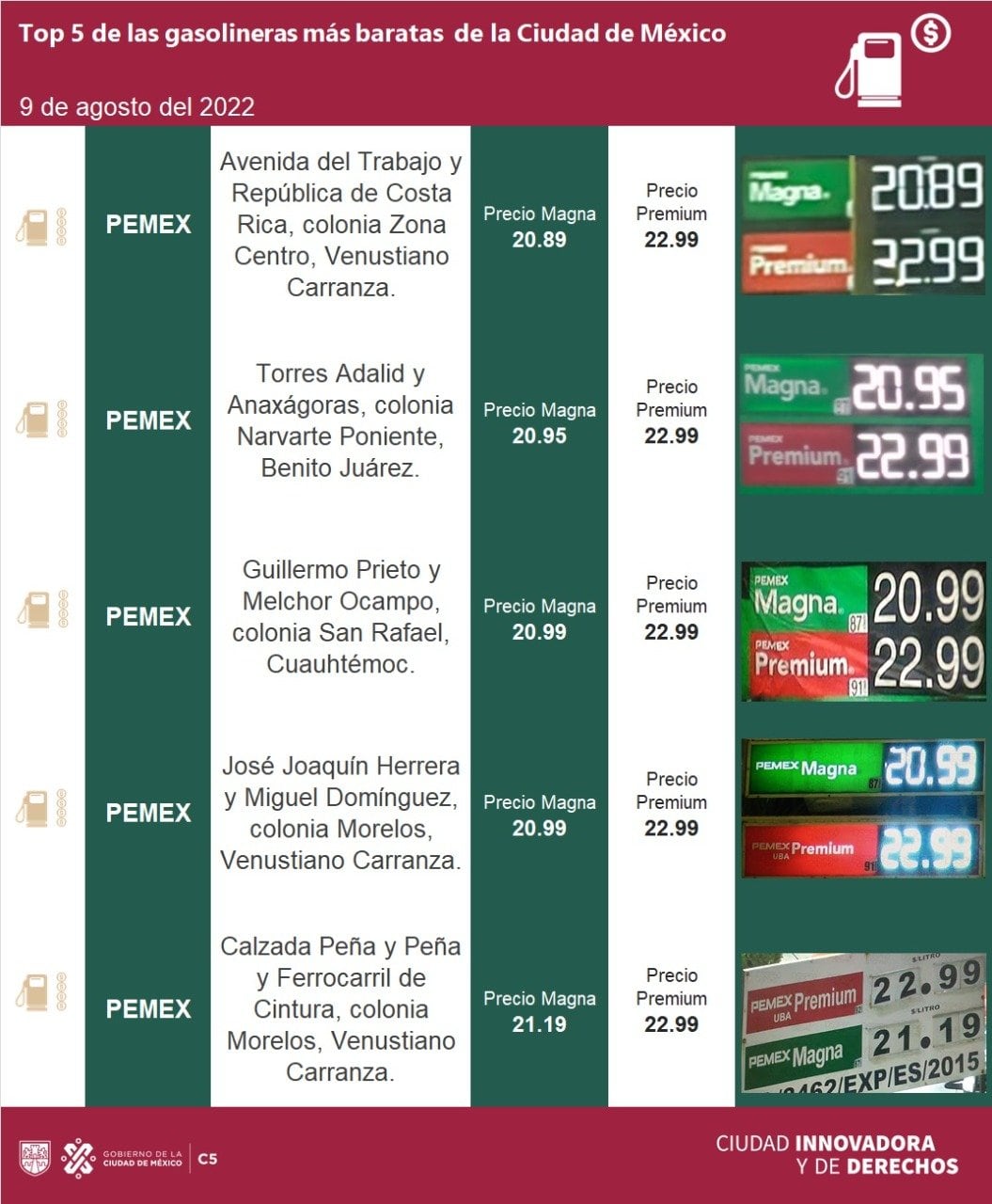 En el reporte del C5 se informa hoy cuáles son las 5 gasolineras con los precios más baratos y cuáles son las 5 con los precios más caros de toda la CDMX.
