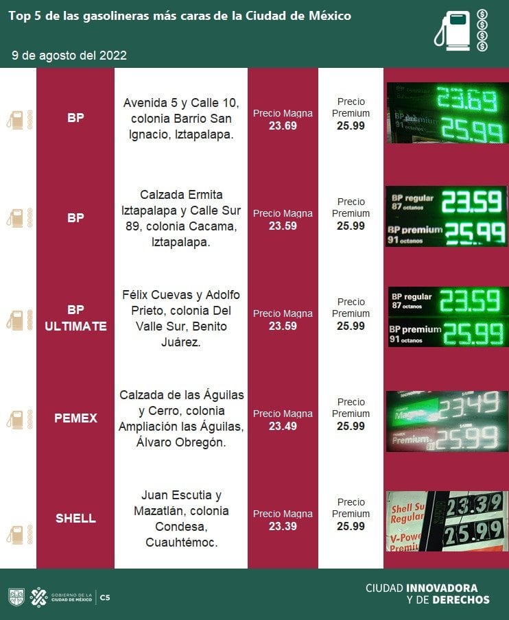 Según el reporte diario del C5 en CDMX, estos son los precios de las gasolineras más caras. Estos son los precios de hoy 9 de agosto de 2022: