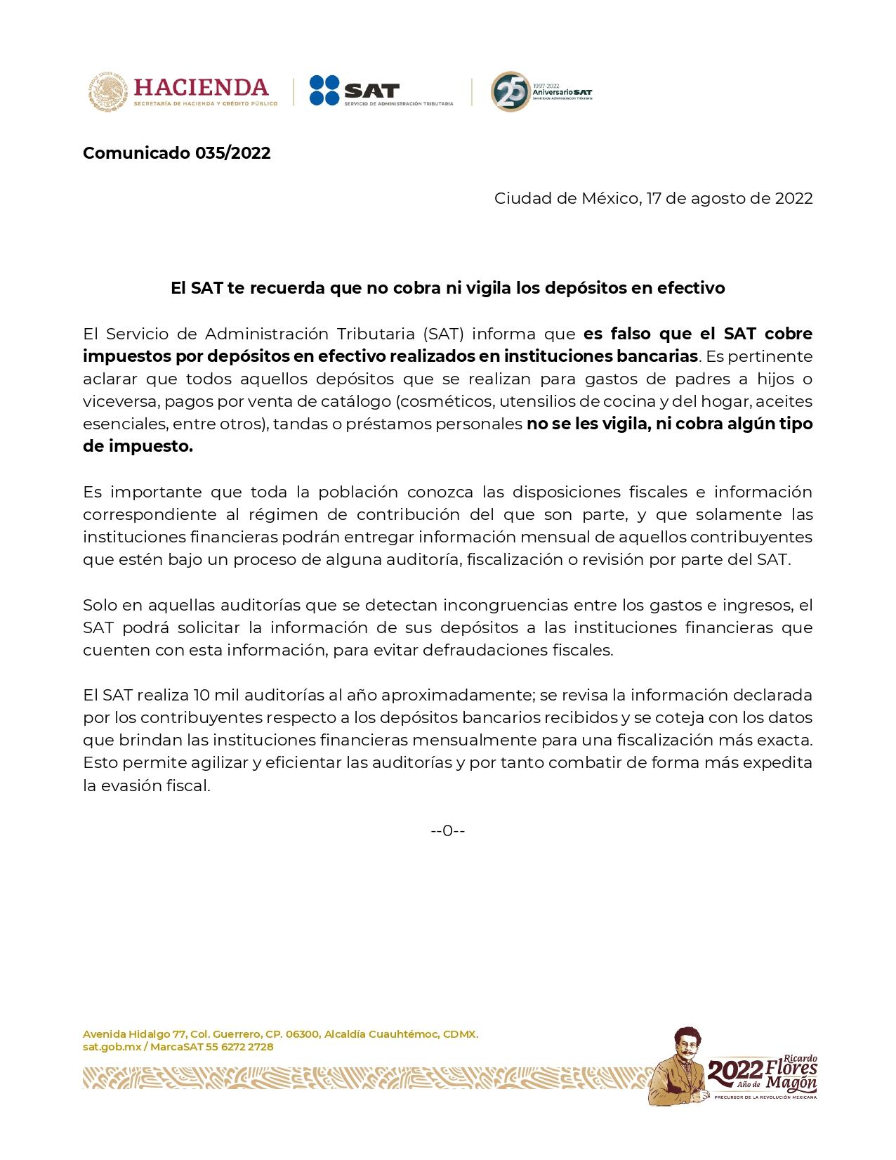 El Servicio de Administración Tributaria (SAT), aclaró si cobra o no por los depósitos en efectivo, como los hechos por venta por catálogo, depósitos de padres a hijos y viceversa o tandas.