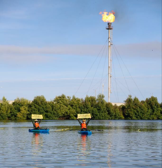 Greenpeace protestó con una manta acuática de 25 metros en las inmediaciones de la refinería Dos Bocas con un mensaje que señala: