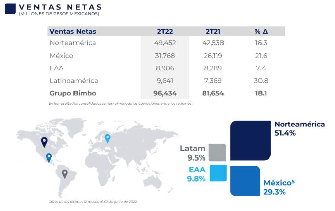 Tomando un enfoque más internacional y comparado con el mismo Q en el 2021, la región de Norteamérica creció un 16.8% (en dólares estadounidenses) y la región EAA (Europa, Asia y África), las ventas netas aumentaron un 7.4% en términos de pesos; excluyendo el tipo de cambio, éstas crecieron un 17.4% ($8,906 millones de pesos), mientras que un crecimiento del 30.8% se registró en Latinoamérica ($9,641 millones mxn).