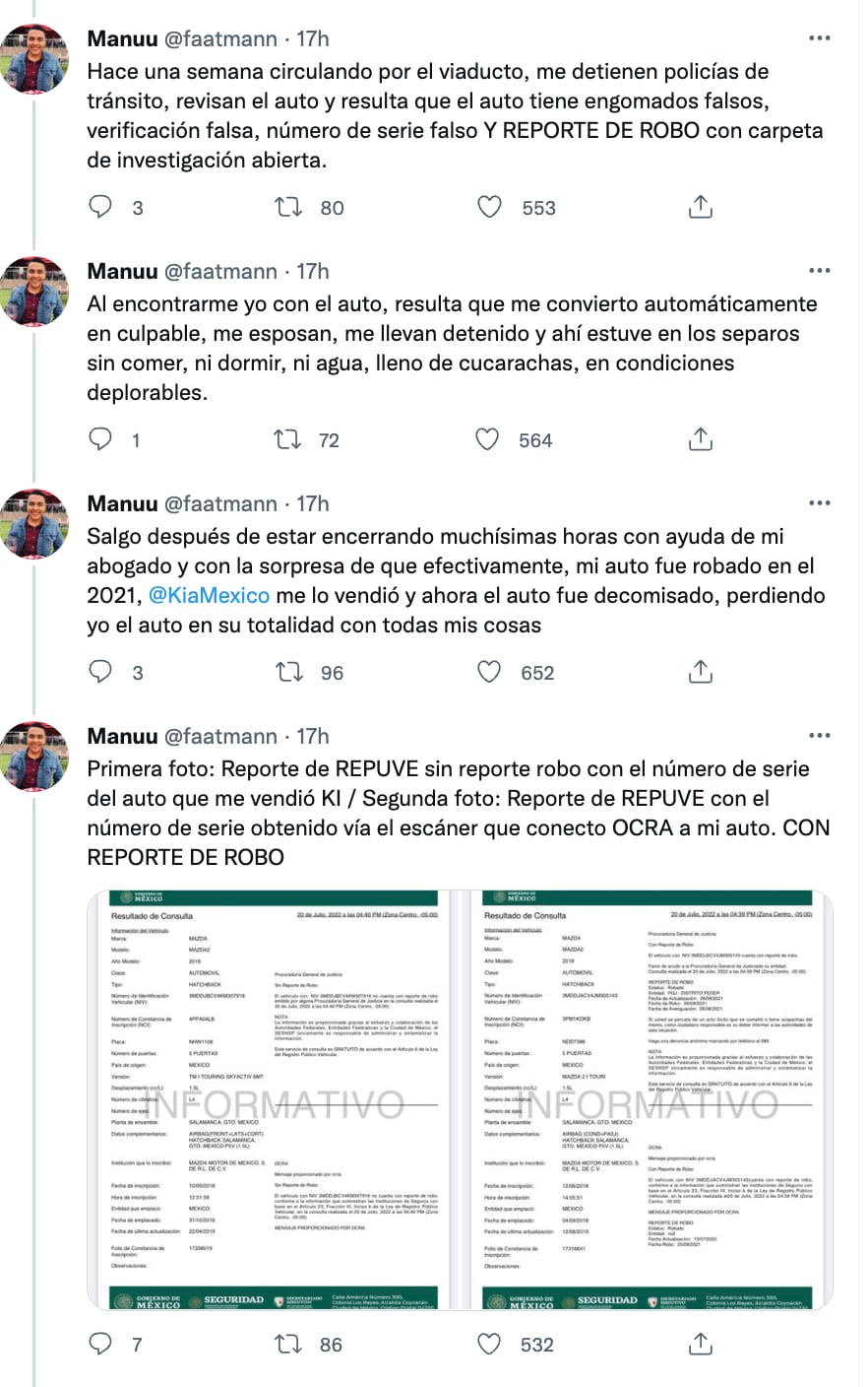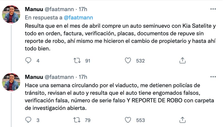 Manuu denunció en redes sociales como compró un auto con los números de serie remarcados y con reporte de robo sin saberlo y terminó siendo arrestado.