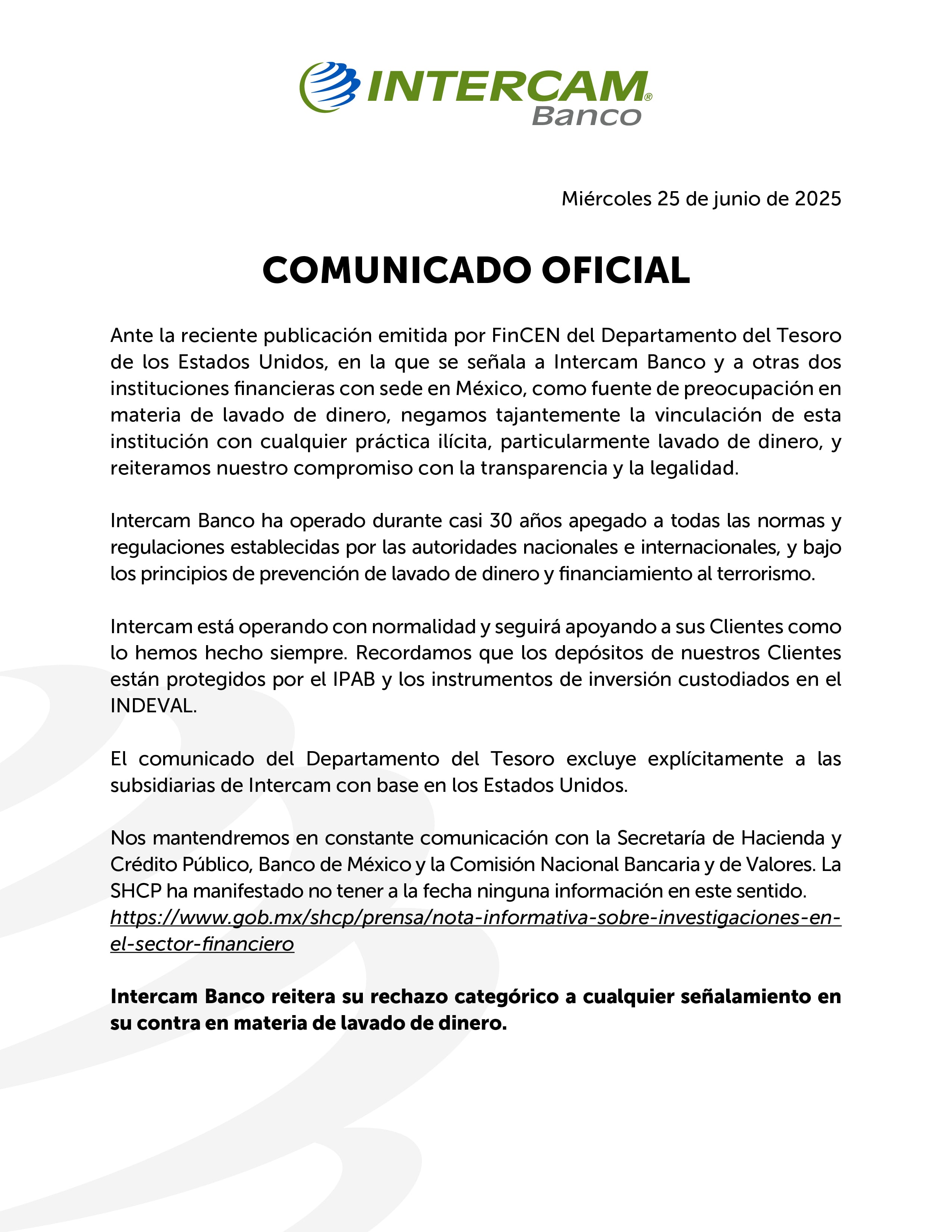 En un comunicado, Intercam refrendó su compromiso con la transparencia y la legalidad, señalando que cuenta con más de 30 años de experiencia operando en apego a todas las normativas internacionales vigentes.