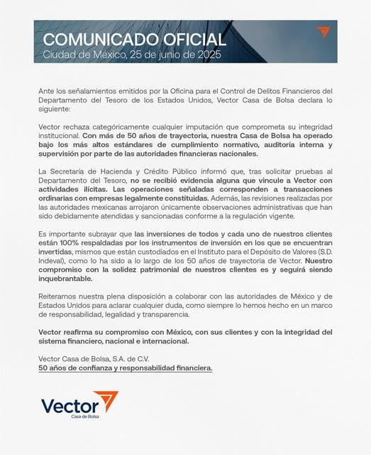 Vector Casa de Bolsa no se quedó atrás, pues también emitió un comunicado para rechazar las acusaciones de la Embajada de Estados Unidos en México en su contra.
