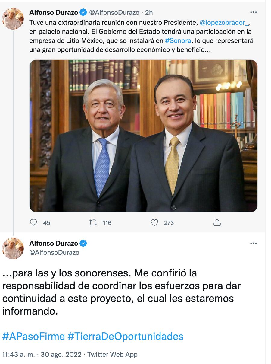 “Tuve una extraordinaria reunión con nuestro Presidente, @lopezobrador_, en palacio nacional. El Gobierno del Estado tendrá una participación en la empresa de Litio México, que se instalará en #Sonora, lo que representará una gran oportunidad de desarrollo económico y beneficio para las y los sonorenses. Me confirió la responsabilidad de coordinar los esfuerzos para dar continuidad a este proyecto, el cual les estaremos informando”