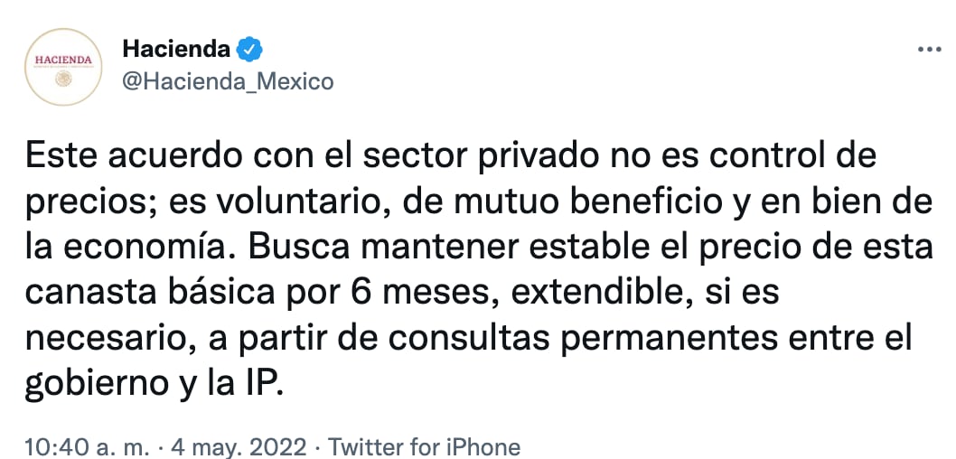 “Este acuerdo con el sector privado no es control de precios; es voluntario, de mutuo beneficio y en bien de la economía. Busca mantener estable el precio de esta canasta básica por 6 meses, extendible, si es necesario, a partir de consultas permanentes entre el gobierno y la IP”