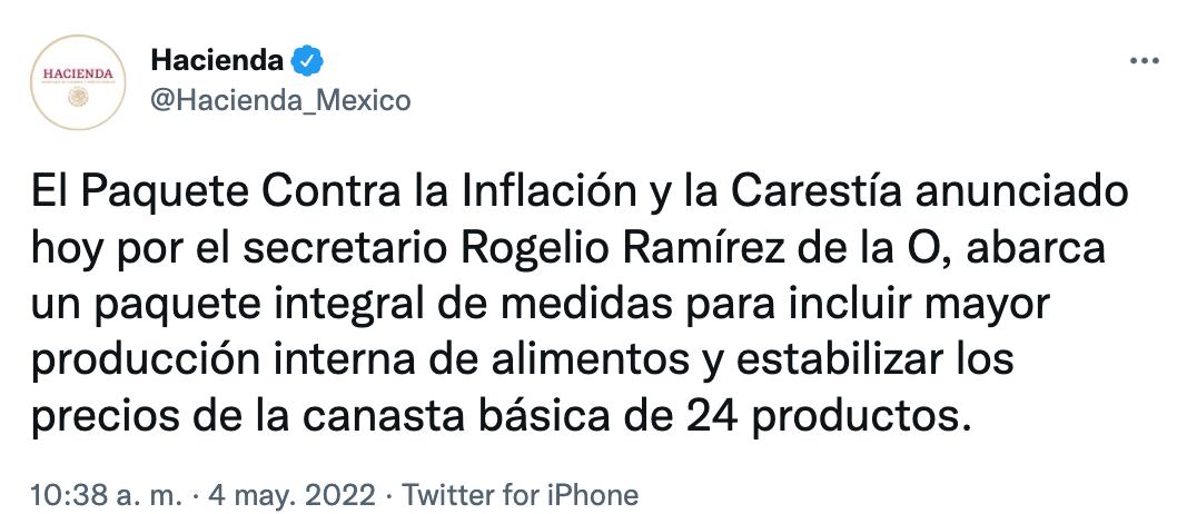 “El Paquete Contra la Inflación y la Carestía anunciado hoy por el secretario Rogelio Ramírez de la O, abarca un paquete integral de medidas para incluir mayor producción interna de alimentos y estabilizar los precios de la canasta básica de 24 productos”